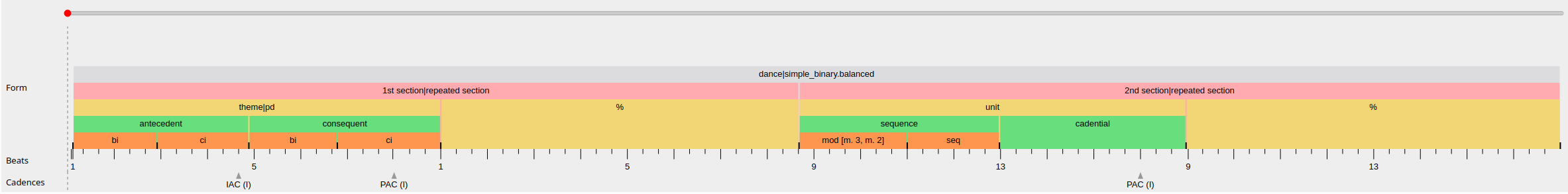 The first half stays in the home key throughout and conforms to the theme type of a “period,” with a 4-bar antecedent and a 4-bar consequent. The consequent starts out as a (motivic) repetition of the antecedent, just to end on a stronger cadence (a PAC rather than an IAC). The second half is launched with a sequential progression (6/5 -> 4/2; bb. 9-12), using a 2-bar “model” consisting of a variant of the movement’s second bar prefaced by a newly composed bar. One particular challenge is the most fitting encoding of bar 13, which fulfils a double function: it acts both as the ending of the sequential pattern and the initial event of the subsequent cadential progression.