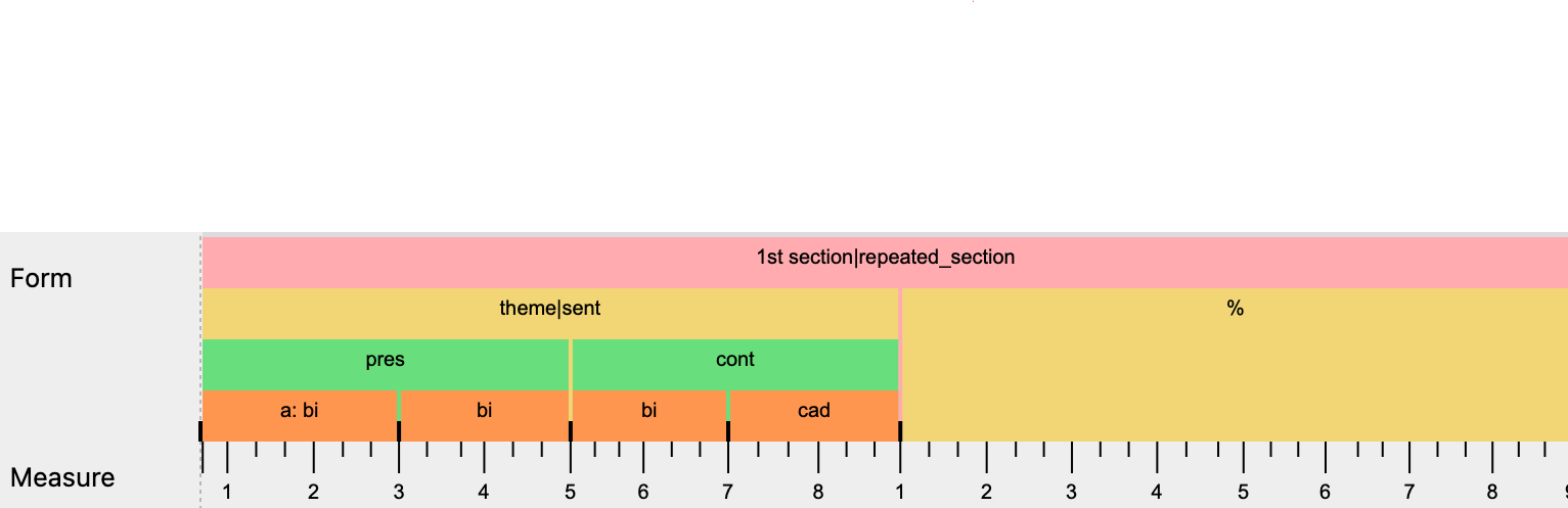 A prototypical sentence consists of a presentation phrase (pres) and a continuation phrase (cont). The typical presentation phrase consists of a basic idea (bi) and its repetition (bi!). The typical continuation phrase consists of a fragmentation (frag) and a cadential unit (cad).