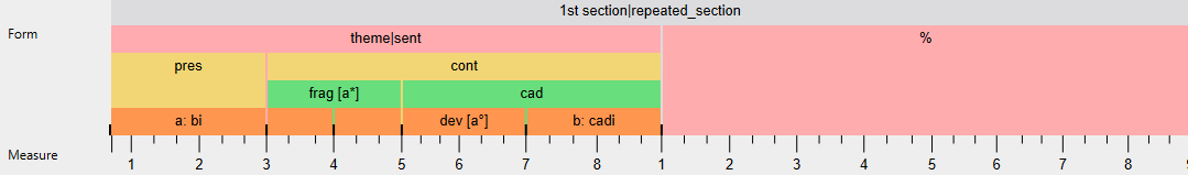 The second analysis tries to remedy these points, revealing this sentence’s idiosyncrasy. Here, the fragmentation is taken as justification for making the continuation start in m. 3. Following the fragmentation, this continuation is completed by a cadential (sub-)phrase that picks up the material of the basic idea (a) and places it into the harmonic context of the cadence’s pre-dominant stage ([a°]). The formal function development, here highlights the varied re-statement of the basic idea’s material in terms of a temporal middle function. The last two measures are labelled as a cadential idea (cadi) because they introduce an idea that is picked up and sequenced in the second section of this piece.