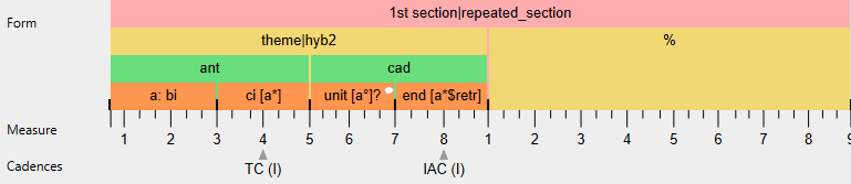 The third analysis originates from the observation of a vague rhyme between mm. 1-2 and 5-6. Interpreting m. 4 as a tonic completion (it is the first tonic and harmonic resting point), in principle, would allow for the application of a somewhat relaxed period concept. Considering, however, that mm. 5-8 have all features of a cadential sub-phrase, here, the whole section is analysed as Hybrid 2 (antecedent + cadential), even though this entails follow-up problems. 1) mm. 3-4 do not fully qualify as contrasting idea, 2) we lack terms for sub-dividing a cadential sub-phrase. The analysis uses unit? with a comment suggesting that pre-dominant might become a formal function if enough empirical support can be found.