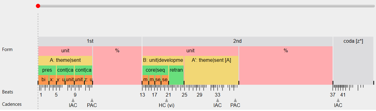 Most pieces in the pilot corpus can be well described with Caplin-esque terms as the ones mentioned. In this Mazurka, the entire A section is a sentence with two continuation phrases.