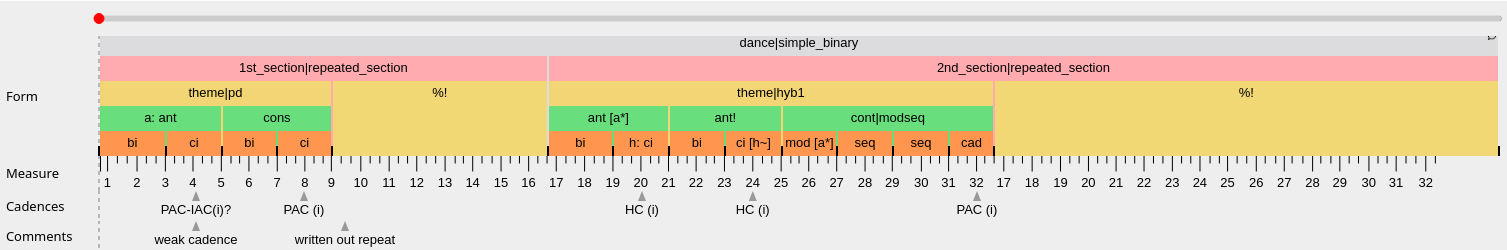 Figure 1 (b) shows a complete analysis. The coloured rectangles are form components, organized in levels: the highest spans the entire piece (dance|simple_binary), the lowest contains individual musical ideas (bi, ci, cad, etc.). Parent levels contain child levels, so the analysis can be read as a tree. Every form component carries a label whose parts are explained below.