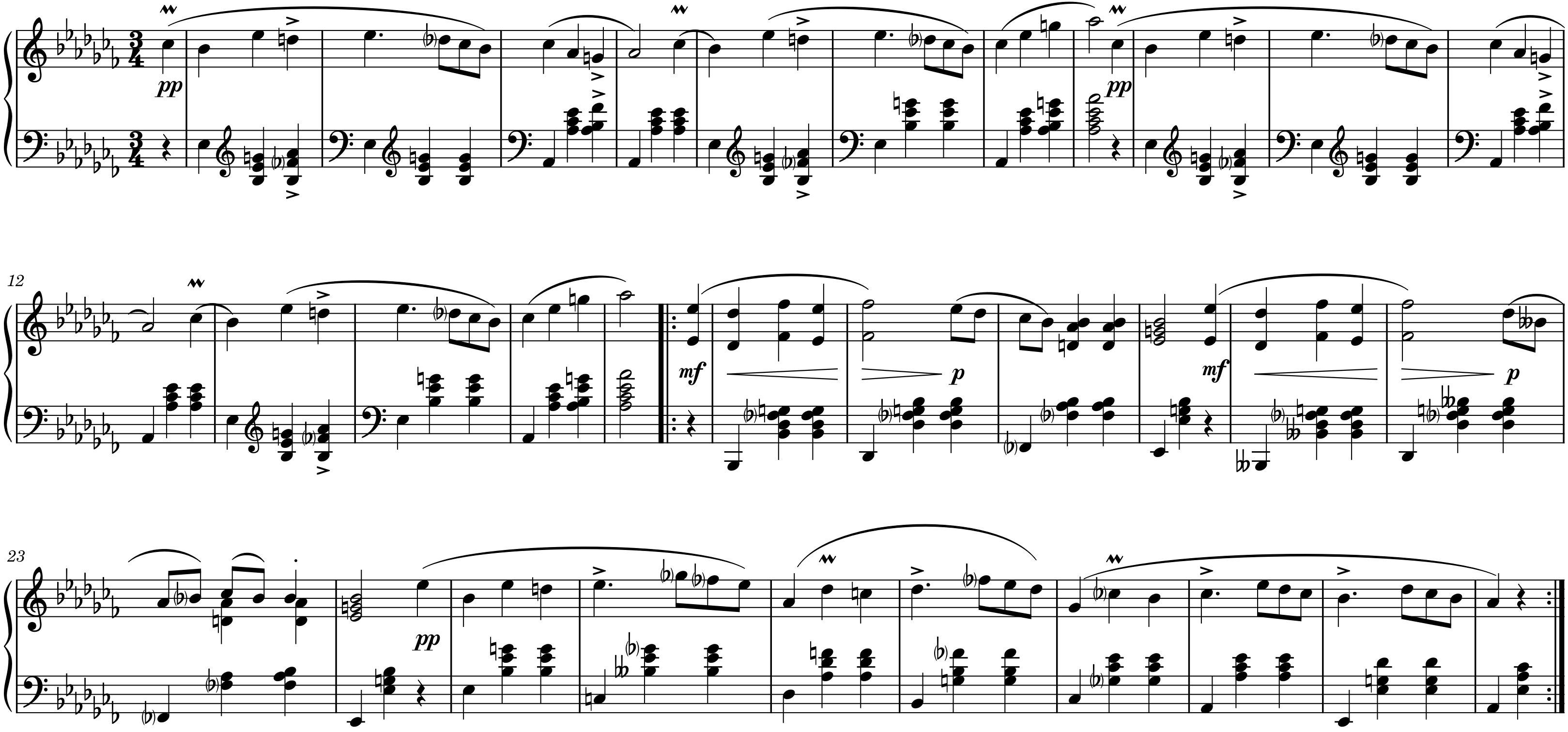 The % symbol signifies that the previous form-functional subtree repeats (all child levels are understood to recur, so they need not be duplicated). When the music also repeats — not just the functional structure — combine it with the exact-repetition operator !, yielding %!. Both halves of the Ländler are repeated (the first repeat being written-out), hence %!. See Repeating a subtree.